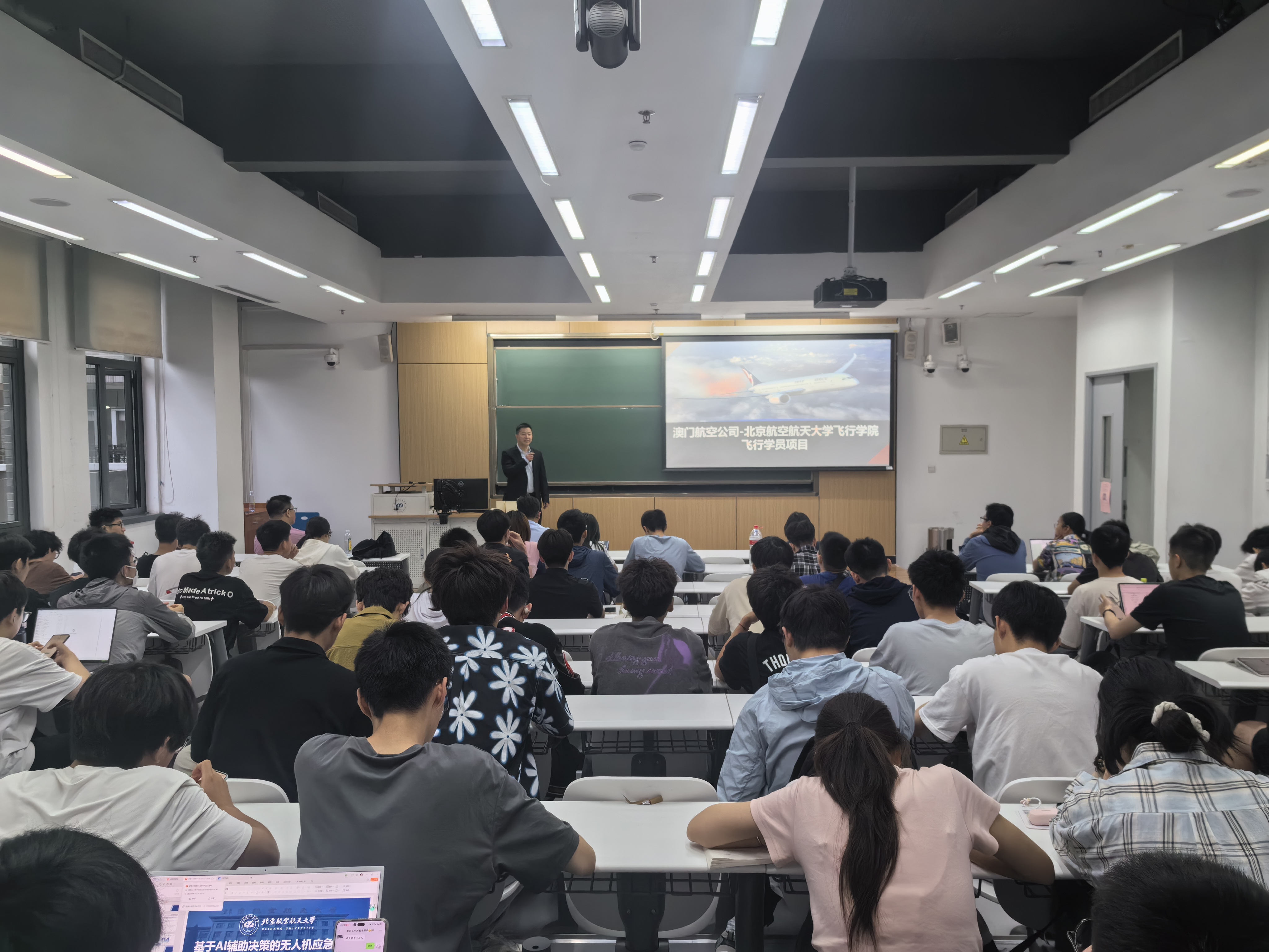 On May 25, 2025, Li Guang, Director of Flight Operations at Air Macau Co, LTD and alumnus of the School of Aviation (SA), Class of 1993, returned to his alma mater to conduct a thematic briefing session for Beihang University’s Class of 2024 students at both Shahe and Xueyuan Road campuses. The briefing detailed the Joint Flight Cadet Training Program co-developed by Air Macau and SA.